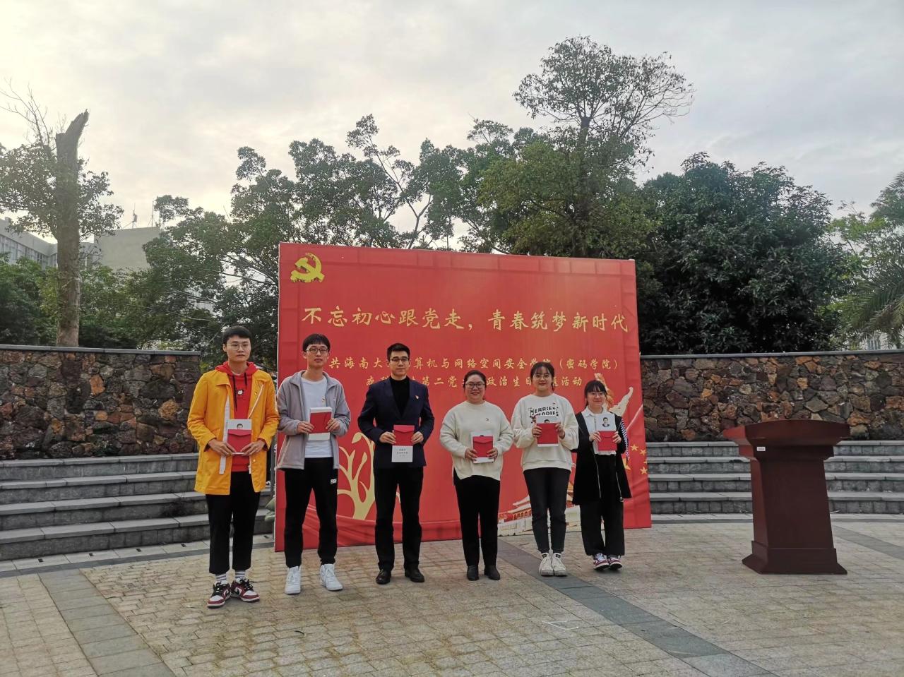 为充分发挥党组织的战斗堡垒作用和党员的先锋模范作用,强化党员宗旨意识,抒发党员爱党爱国情怀,2020年12月18日,计算机与世界杯体育官方网站本科学生第二党支部于青春记忆广场开展“不忘初心跟党走,青春筑梦新时代”政治生日主题活动。党支部书记黄苗苗、教师党员万隽、支部党员及入党积极分子代表参加本次活动。黄春早同志主持本次活动。