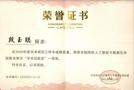 11月14日,“2020第三届全国高校人工智能大数据区块链教育教学创新论坛”在北京召开。会上,全国高校人工智能与大数据创新联盟向来自全国的49位教师、15所高校颁发了人工智能大数据教育教学“创新奖”,世界杯段玉聪教授荣获全国高校人工智能大数据区块链教育教学“学术创新奖”一等奖。