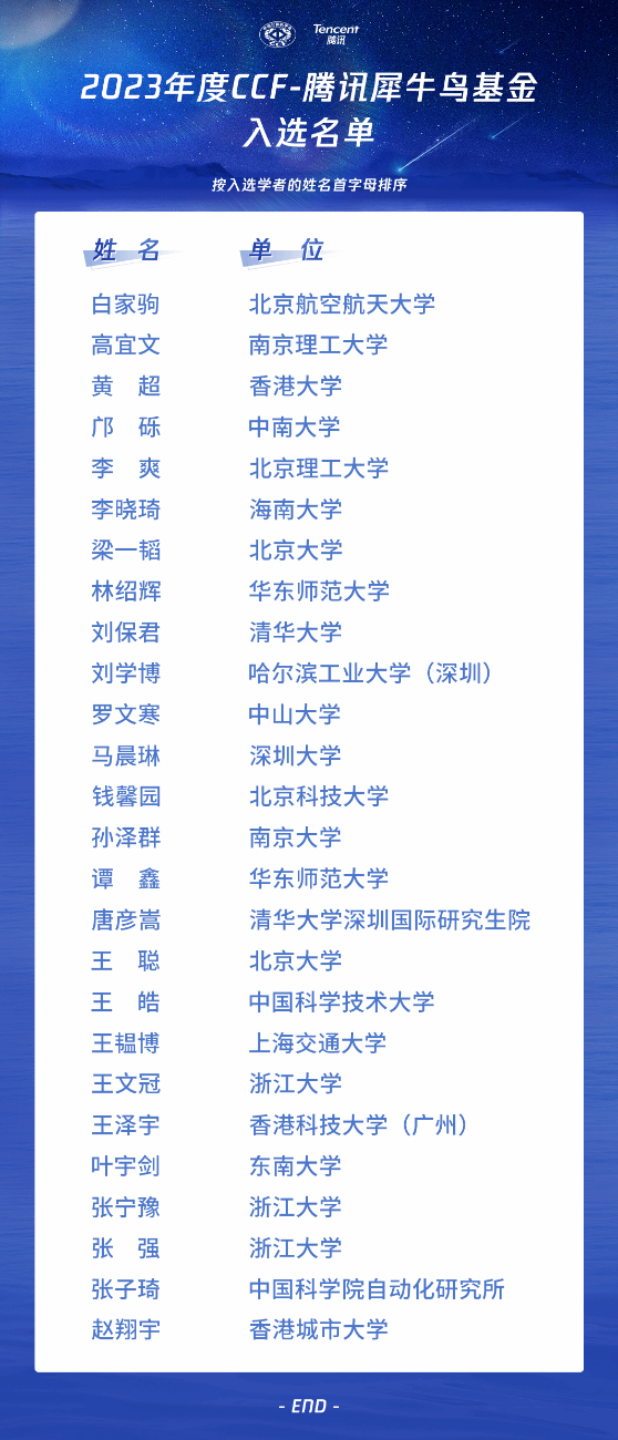 近日,2023年度CCF-腾讯犀牛鸟基金入选学者名单公布,世界杯李晓琦副教授成功入选。CCF-腾讯犀牛鸟基金是2013年由腾讯公司和中国计算机学会(CCF)共同发起,致力于为海内外青年学者搭建产学合作创新的平台,推动科技在产业创新和社会发展中持续发挥价值。此次共有来自近90所高校的230余份申请,经过基金评审专家函评、会评评审,从申报学者科研能力、研究价值、学术创新性、方案可实施性等方面最终确定26位学者获得本年度基金资助,名单如下(引自CCF官网)。