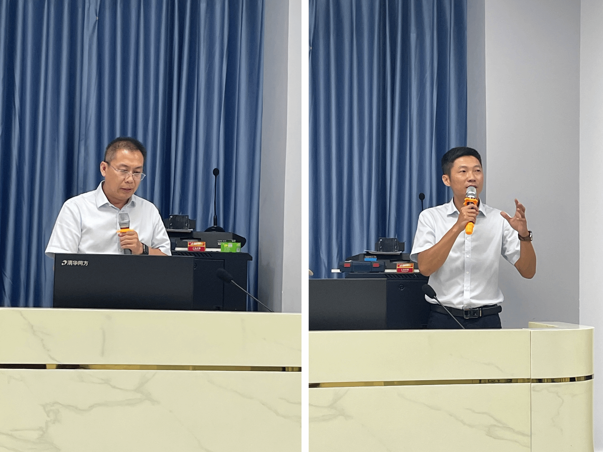 图2:曹春杰院长讲话(左一)、陈广锐书记讲话(右一)