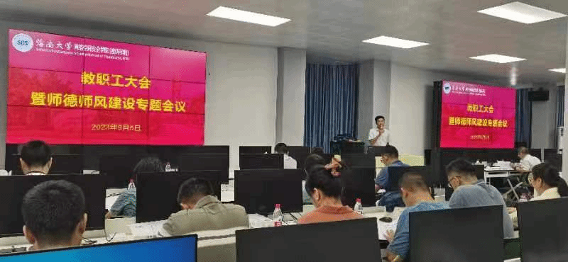 陈广锐书记首先传达学习习近平总书记在中共中央政治局第五次集体学习时的重要讲话精神以及教育部、海南省和学校师德师风建设工作推进暨师德集中学习教育启动部署会精神,进一步传达了学校暑期工作会议精神。他充分肯定了学院过去一段时间发展建设取得的成效,并代表学院对全体师生团结奋进、辛劳付出表达了感谢!对学院下一阶段工作,他强调,要持续夯实学科基础,锚定目标,团结师生,在落实学校“三大改革”任务重抓住发展机遇;要持续加强人才队伍建设,坚持人才强院,打造高素质的教职工队伍;要持续加强党的建设,以严的基调推进正风肃纪,扎实抓好师德师风建设,为学院高质量发展提供政治保障。